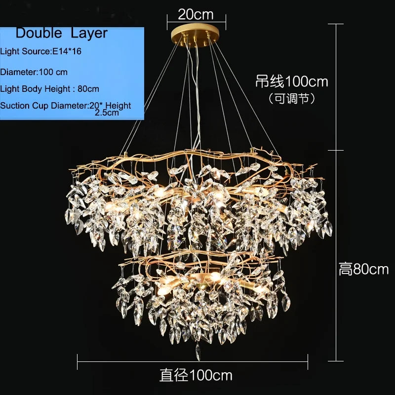 Illuminate and enhance your home with this Elegant Long Gold K9 Crystal Chandelier. It seamlessly combines elegance, luxurious design, branch-style chandeliers, K9 crystal adornments, and versatility for a sophisticated and well-lit living environment in spaces such as the kitchen, dining room, bedroom, and living room.