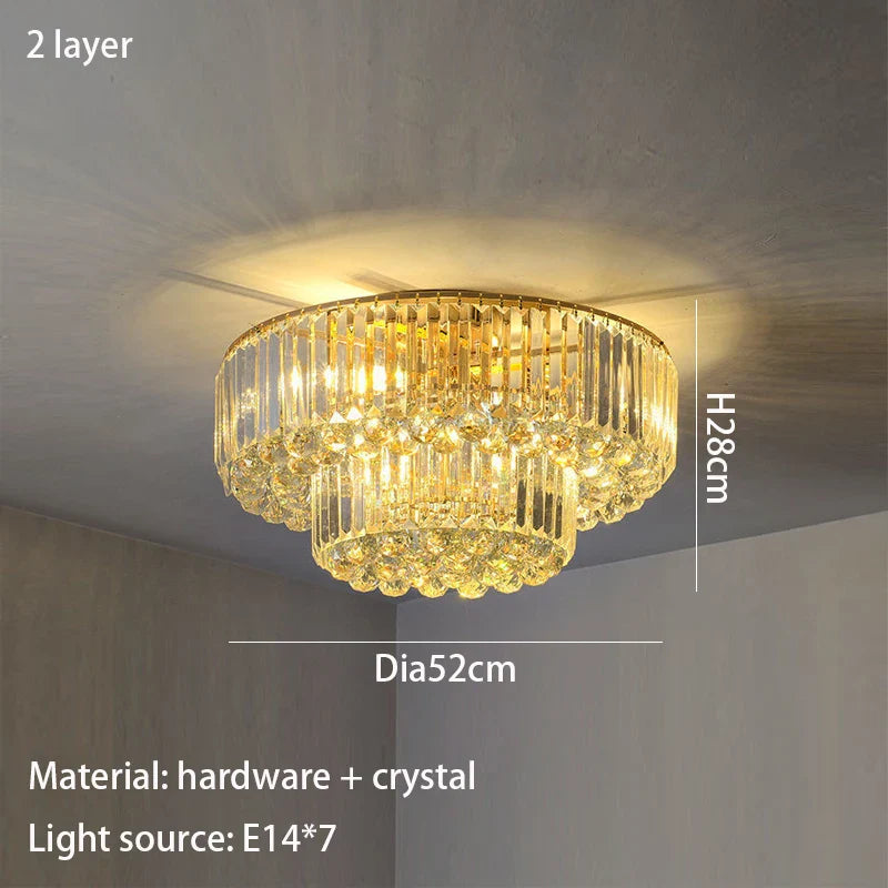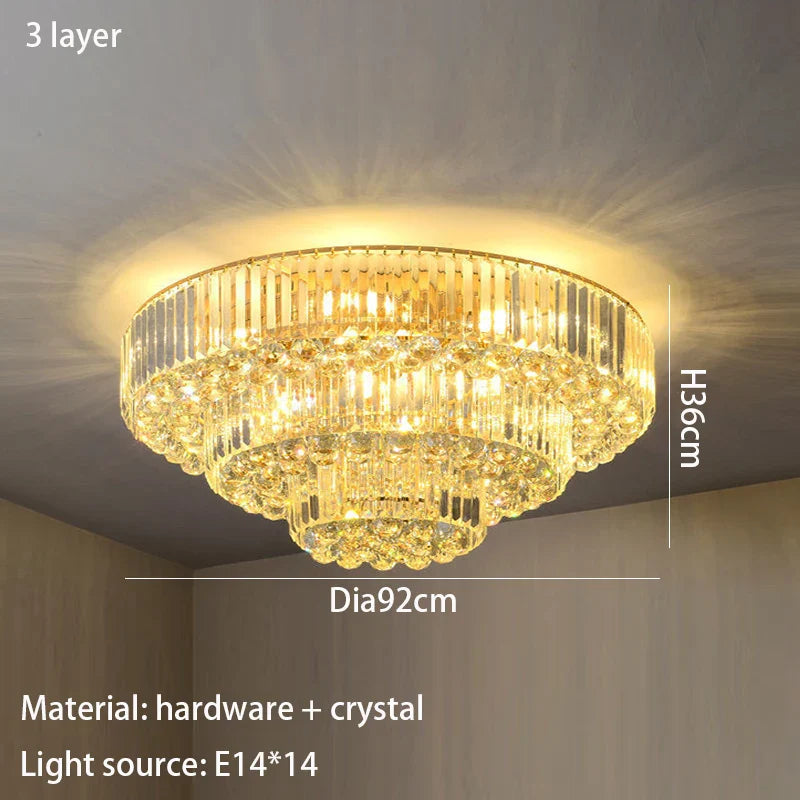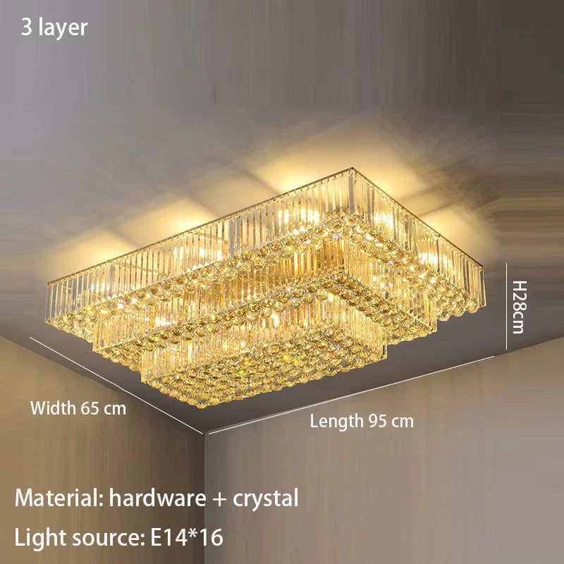 Enhance the ambiance of your home with our Modern Golden Rectangle Round Crystal Ceiling Light. This exquisite lighting fixture brings a touch of luxury and sophistication to any room, from living rooms and dining areas to bedrooms and villa halls. Crafted with precision, it seamlessly combines modern simplicity with the brilliance of crystal, creating a focal point that elevates your interior decor.