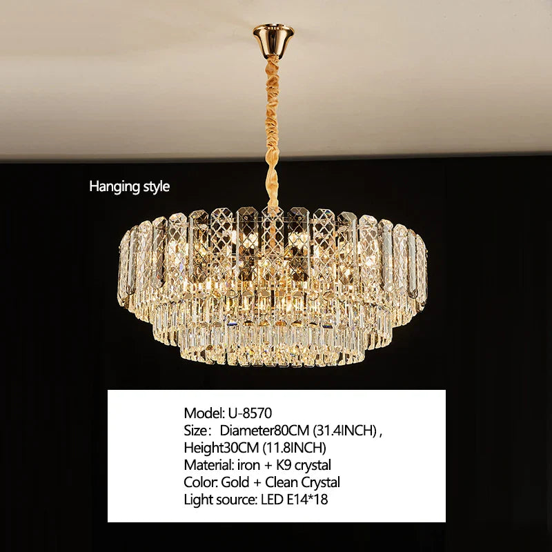 Elevate the ambiance of your dining room with our High-End Crystal Ceiling Lamp, featuring the latest in light luxury design. Crafted with precision and adorned with K9 crystals, this exquisite chandelier creates a captivating and luxurious atmosphere. It stands as a popular main lamp chandelier, enhancing the aesthetics of your dining space and adding a touch of high-end elegance.
