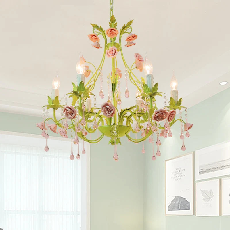 Elevate your interior decor with this European Rose Flower Chandelier. Crafted with a touch of European elegance, this chandelier features a lush green lustre light and comes in three size options: 6L, 8L, and 12L. The charming pink rose flower accents add a touch of romance and style to your decor.