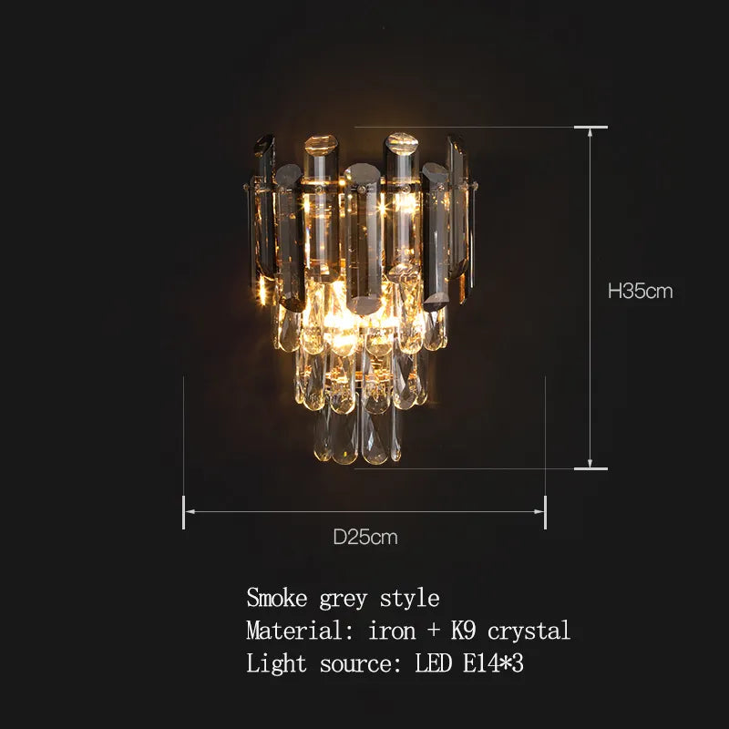 Introducing Abigail's Modern LED Crystal Wall Lamp, a symbol of modern elegance and sophistication that enhances the ambiance of your bedroom, bedside, living room, study, hallway, or aisle. This exquisite wall lamp is available in three stunning styles: clean crystal, smoke gray crystal, and a combination of clean crystal and smoke gray crystal. It features high-quality materials, including iron and K9 crystal, and offers versatile lighting with an LED E14 bulb that can change color.