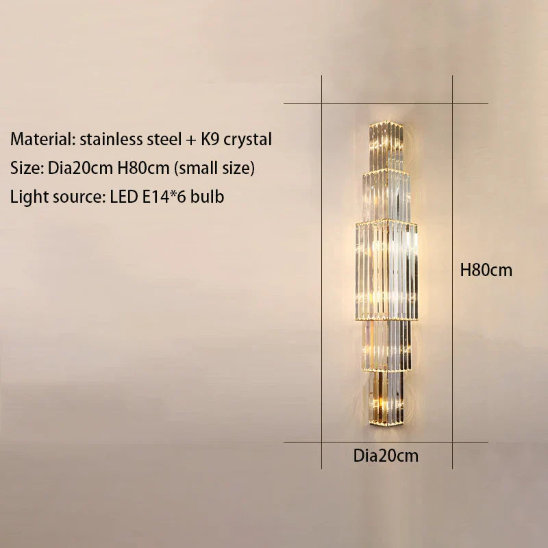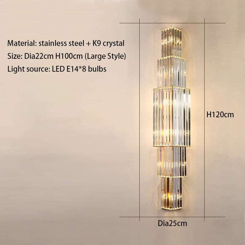 Introducing Victoria's Large Crystal Wall Light, a symbol of modern luxury and decorative lighting that elevates the ambiance of your living room, hall, bedroom, loft, indoor spaces, or even upscale hotel and villa settings. This grand wall light showcases a modern gold finish and is adorned with high-quality K9 crystal elements. It offers versatile lighting options with an LED E14 light source and includes the bulb for your convenience. The product is packaged securely for delivery with export-standard packaging.