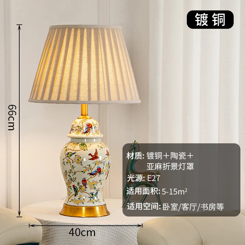 This decorative ceramic table lamp features an artistic floral and bird motif paired with a soft fabric shade, creating a warm and inviting lighting atmosphere. Designed with a modern-retro aesthetic, it enhances interior spaces with refined visual appeal while providing comfortable illumination for study, bedside, or living areas.