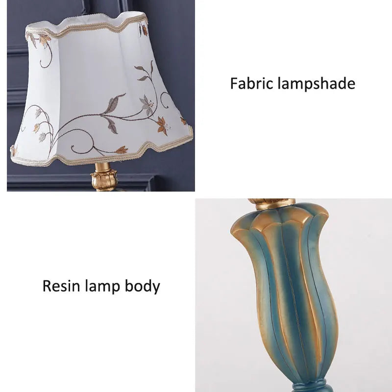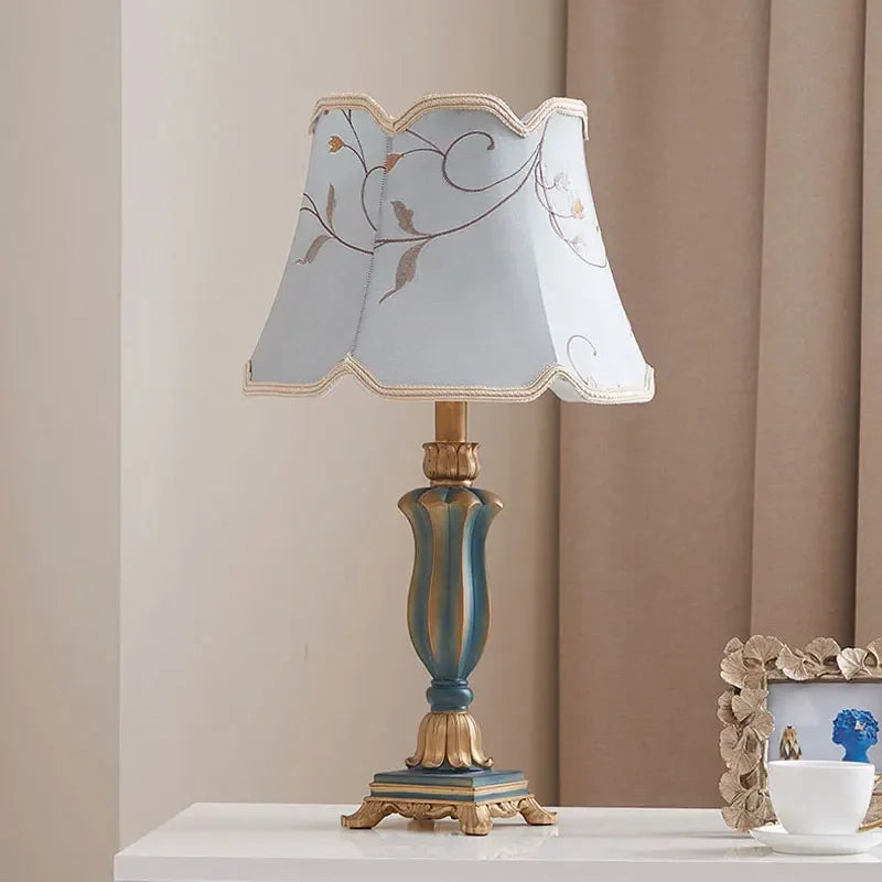 Nordic Retro Carving Green Resin Table Lamps Printing Fabric Lampshade Living Room Bedroom Restaurant Kitchen Study Desk Lights
